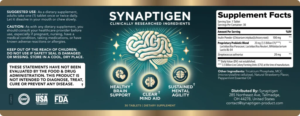 Manufactured in the USA in GMP-certified facilities, Synaptigen is made with high-quality ingredients, is non-GMO, and free from common allergens. Available in easy-to-take tablets, it offers a practical way to support cognitive well-being. With a 180-day satisfaction guarantee, Synaptigen has quickly become a popular choice for those seeking to maintain a clearer, more focused mind in 2025.